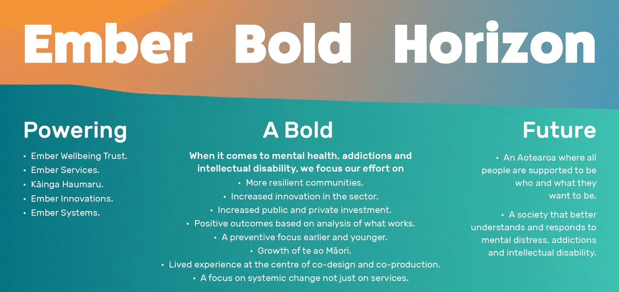 Bold Horizon is Ember’s long term strategic plan. It brings focus across all five entities within Ember Korowai Takitini, allowing us to concentrate on areas where we believe we can create meaningful change.